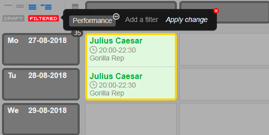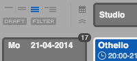Events that have a status of type “Option” are ordered based on the moment when the event was booked in Yesplan. This order appears in the calendar (the number in the yellow circle near the event), letting you know which option was placed in the calendar first. Options are thus not sorted according to the start time of the show. Moreover, they appear in a separate section under the events on that day that don’t have a status of type “Option”.