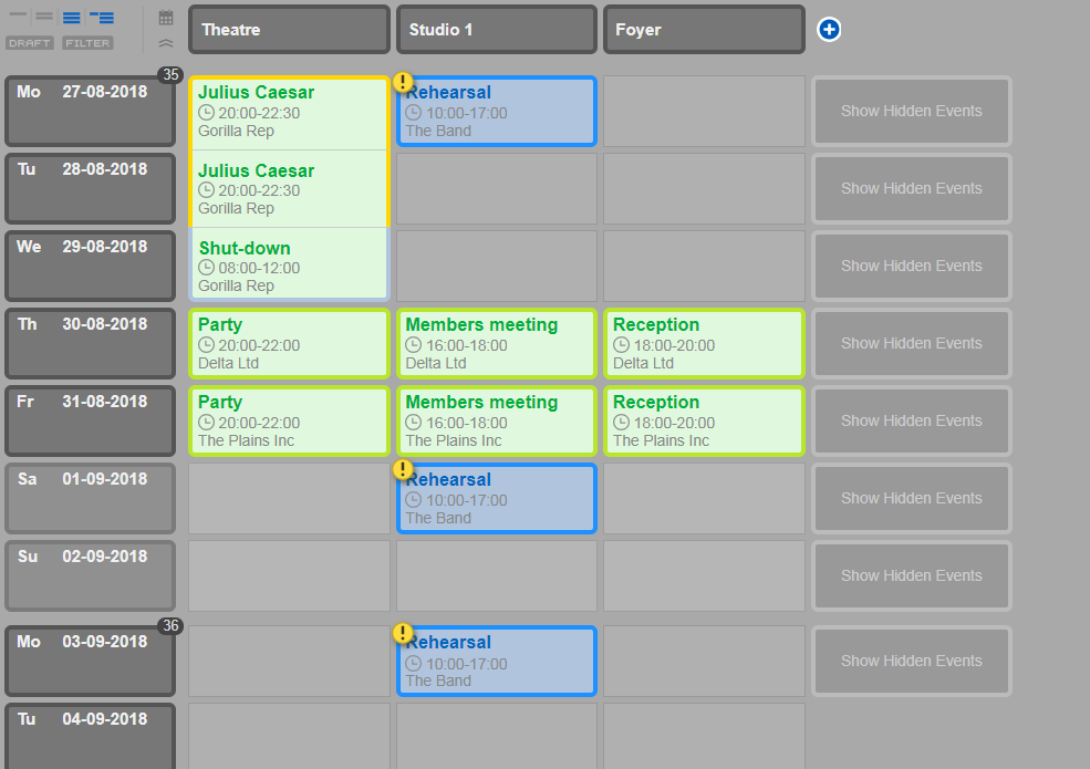- Question mark: The event contains booked placeholders which haven’t been swapped yet, see Placeholder booking for more information.