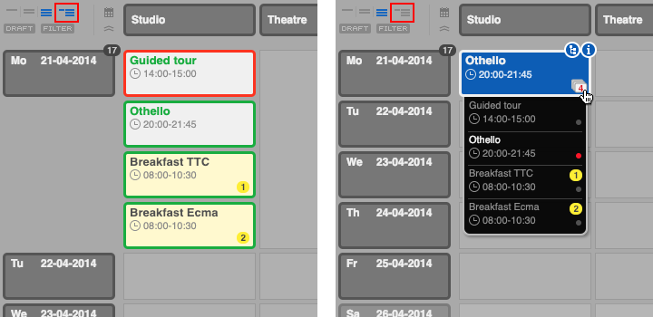 With the filter, you can limit the displayed events in your calendar based on status, profile or label, and you can choose to hide unavailabilities. When a calendar is filtered, the filter icon in the upper-left corner turns red.