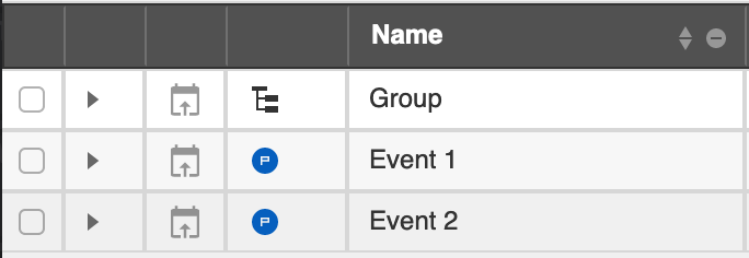 - If the event is a production or a group, the fourth column will display the blue icon for productions and an icon for the tree structure respectively.