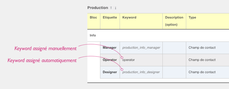 Le champ de données personnalisées portant l’étiquette « Designer » dans l’image ci-dessous reçoit automatiquement le keyword « production_info_designer », tandis que le keyword « operator » a été assigné manuellement au champ de données personnalisées portant l’étiquette « Operator ». Un keyword choisi manuellement est donc affiché en texte noir, alors qu’un keyword généré automatiquement est affiché en texte gris et italique.