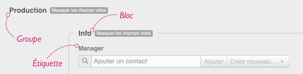 Blocs : Au sein d’un groupe, les champs de données personnalisées peuvent à leur tour être répartis en blocs :