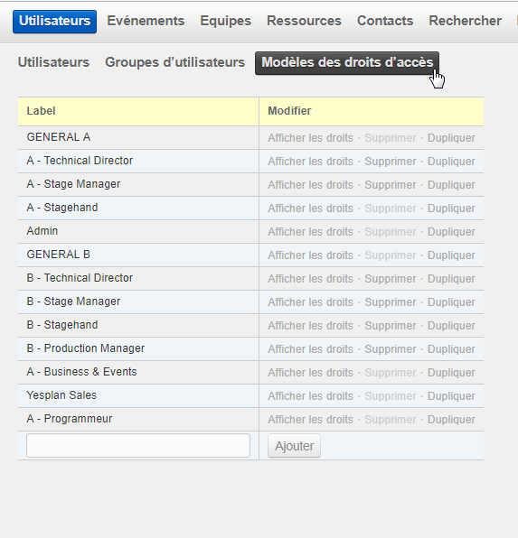 Pour ajouter un nouveau modèle des droits d’accès, introduisez un nom pour le modèle dans la dernière ligne, puis cliquez sur le bouton « Ajouter ». Double-cliquez sur le nom d’un modèle des droits d’accès existant pour le modifier.