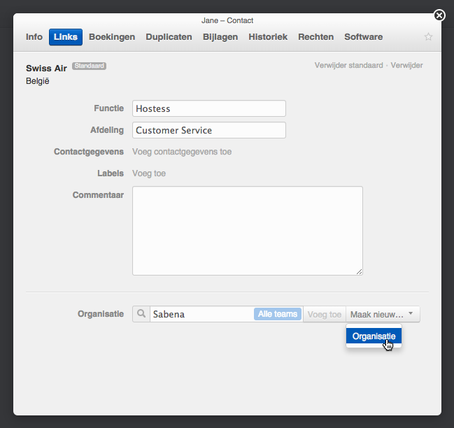 L’ajout des liens vers le contact dans l’onglet « Liens » de la fenêtre d’information d’un contact a été amélioré. Désormais, vous pouvez y utiliser l’habituel champ de saisie détaillé que nous connaissons des données personnalisées. Il permet aussi de créer directement dans cet onglet une nouvelle personne ou une organisation qui n’existent pas encore.