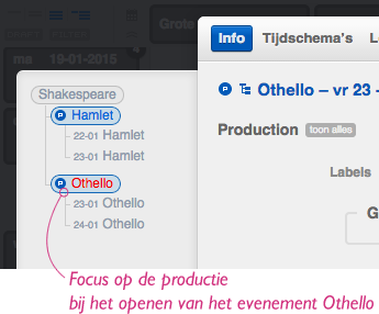 Le comportement actuel est le suivant : à l’ouverture de la fenêtre d’information d’un événement associé à une production à partir du calendrier, la production est activée. Vous pouvez ensuite sélectionner manuellement l’événement si vous le souhaitez, mais c’est la production qui est sélectionnée par défaut à l’ouverture de la fenêtre d’information. Cela signifie que les valeurs que vous encodez au niveau de la production (telles que l’heure de début) seront appliquées à tous les événements associés.