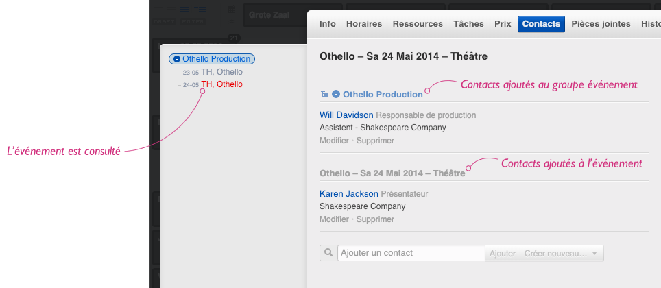 Vous pouvez réserver des contacts pour des événements, par exemple comme personne de contact ou comme coordinateur d’un spectacle. Vous pouvez aussi réserver des contacts pour des ressources et des contacts.