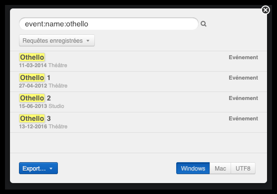 Le résultat de cette requête sera une liste de tous les événements dont le nom contient « othello ». Le word ne doit donc pas correspondre exactement à la valeur de la propriété, mais peut être une partie de cette valeur. Dans l’exemple ci-dessous, vous voyez que les événements nommés « Othello », « Othello 1 », « Othello 2 » et « Othello 3 » figurent parmi les résultats. Cette règle vaut pour la plupart des keywords dont la propriété recherchée est un nom ou un bout de texte, comme name. Toutefois, pour les keywords dont la propriété recherchée est une date ou un nombre, la correspondance devra être exacte.