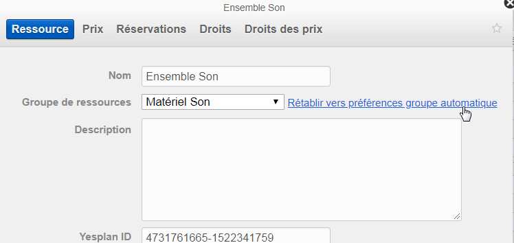 Le groupe de ressources est inféré automatiquement par Yesplan sur la base des ressources contenues dans l’ensemble. Mais vous aurez parfois besoin de pouvoir modifier manuellement le groupe de ressources inféré automatiquement par Yesplan pour le remplacer par autre chose. Vous pouvez le faire dans l’onglet « Ressource » de la fenêtre d’information de la ressource. Cliquez sur « Redéfinir le groupe de ressources » et sélectionnez ensuite l’option souhaitée dans le menu déroulant. Vous pouvez toujours revenir à l’inférence automatique du groupe pour un ensemble en cliquant sur « Rétablir l’inférence automatique du groupe » (cette option apparaît après modification du groupe).