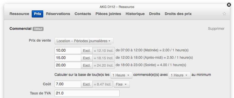 • La ressource « Micro » a une définition de prix « Location commerciale », avec un taux de TVA de 21 %.