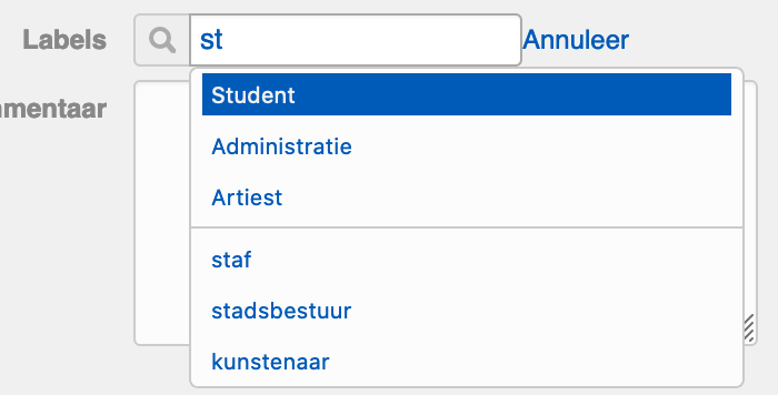 - Onder de lijn zie je de voorgestelde waardes die ‘st’ bevatten: ‘staf’, ‘stadsbestuur’ en ‘kunstenaar’. Deze zijn ooit al door andere gebruikers ingevuld en verschijnen enkel als de gebruiker iets in het veld begint te typen.