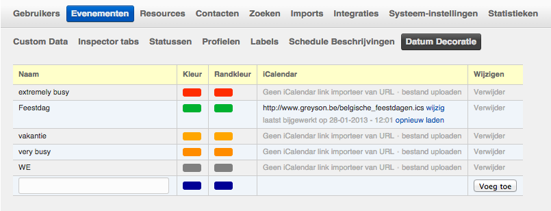 Dit scherm toont een lijst met de datumdecoraties die ingesteld zijn in Yesplan, in alfabetische volgorde. Maak een nieuwe datumdecoratie aan door de velden in de laatste rij van de tabel in te vullen en op “Voeg toe” te klikken.