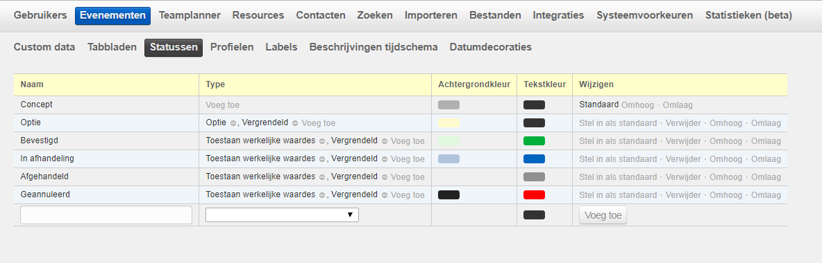 Je kan de statussen voor evenementen beheren in “Systeeminstellingen” > “Evenementen” > “Statussen”.