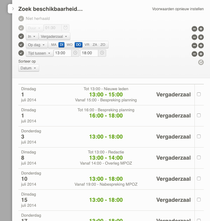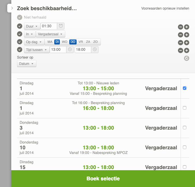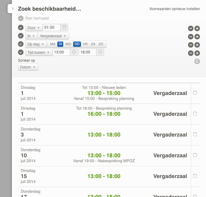 Je ziet de beschikbare tijden onder de zoekopdracht. In het voorbeeld is er een eerste beschikbaar moment op dinsdag 1 juli van 13:00 tot 15:00 uur. De tweede mogelijkheid in de lijst geeft aan dat je het evenement ook kan boeken tussen 16:00 en 18:00 uur. Bij deze twee mogelijkheden valt ook af te lezen dat de Vergaderzaal tussen 15:00 en 16:00 uur daarentegen niet vrij is omdat er reeds een evenement ‘Bespreking planning’ doorgaat. De derde mogelijkheid in de lijst geeft aan dat de Vergaderzaal op de donderdag erna tussen 13:00 en 18:00 uur helemaal vrij is, de vierde dat u ook kunt inplannen op donderdag 10 juli tussen 13:00 en 18:00 uur enz.