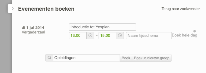 In Yesplan kan je snel zoeken naar beschikbare plaatsen in de kalender. Yesplan zal aan de hand van enkele zoekvoorwaarden de mogelijke beschikbare tijden en locaties tonen. Op deze beschikbare tijden kan je dan meteen een evenement inplannen.