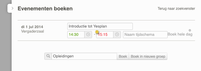 Bij deze tweede stap, het boeken, krijg je ook waarschuwingen als je tijden kiest die de beschikbaarheid overschrijden. In figuur 5 is een later tijdstip ingegeven zodat het evenement zou lopen van 14:30 tot 15:15. De eindtijd is hier gemarkeerd met een uitroepteken wat duidt op een conflict. De eindtijd valt immers na 15:00 uur, de starttijd van het evenement ‘Bespreking planning’ dat op dat moment in de Vergaderzaal doorgaat.