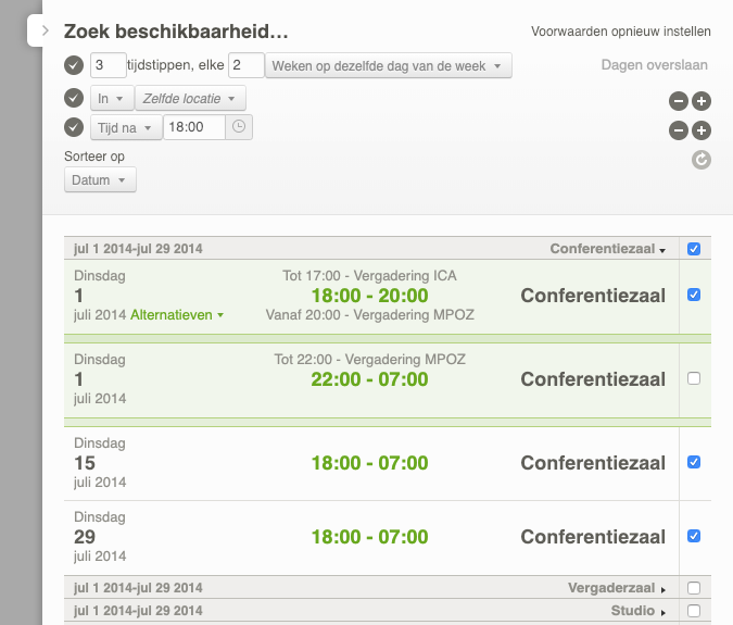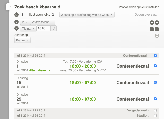 Met het vinkje links van elke zoekvoorwaarde kan u de voorwaarde tijdelijk uitschakelen. Dit laat toe om snel variaties op de zoekopdracht uit te proberen. In het voorbeeld is dinsdag 8 juli niet getoond (zie figuur 1). Om te verifiëren of je het evenement die dag toch zou kunnen inplannen met een kortere duur, kan je de voorwaarde “Duur” even uitschakelen (zie figuur 2). In het voorbeeld verschijnt er een nieuwe mogelijkheid op dinsdag 8 juli tussen 13:00 en 14:00 uur. Je zou dus kunnen besluiten om het evenement in te korten tot een uur en het toch op die datum inplannen.