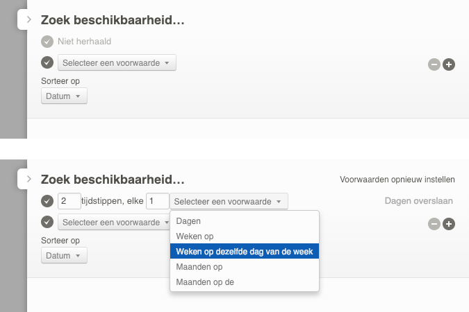 Als voorbeeld gaan we op zoek naar beschikbare momenten voor een cursus van drie tweewekelijkse avondlessen. Hierbij ligt noch de locatie, noch de weekdag voor de lessen al vast, maar is het wel de bedoeling dat de lessen allemaal in dezelfde locatie en op dezelfde weekdag doorgaan. We kunnen dit opgeven door de gewone zoekvoorwaarden te combineren met een herhaling.