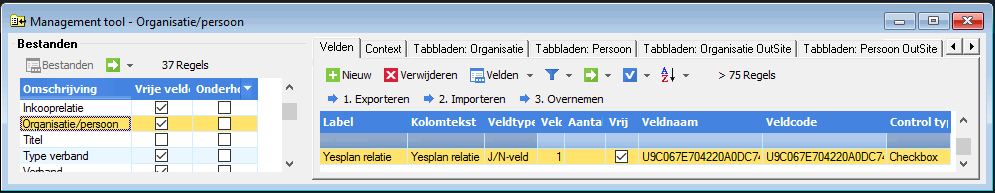 | Contact > Organisatie/Persoon > Vrije velden > Yesplan relatie | Yesplan relatie | Contact – Organisatie/Persoon | Yesplan relatie | Ja/Nee |
