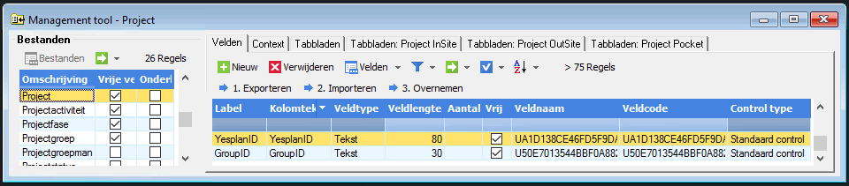 Bij “Project” moet je twee vrije velden met type “Tekst” toevoegen, met labels “YesplanID” en “GroupID”: