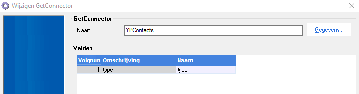 In het venster “Wijzigen GetConnector” dient voor elk veld de “Naam” overeen te komen met de “Omschrijving” (dit is hetzelfde als “Veld” in de “Wizard gegevensverzameling”):