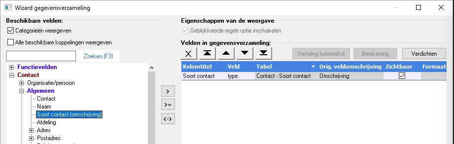- De kolom “Beschikbaar Veld” geeft aan waar je elk veld kan vinden onder “Beschikbare Velden” in de wizard. Selecteer de optie “Categorieën weergeven” om de velden te vinden.