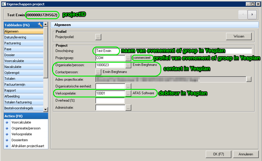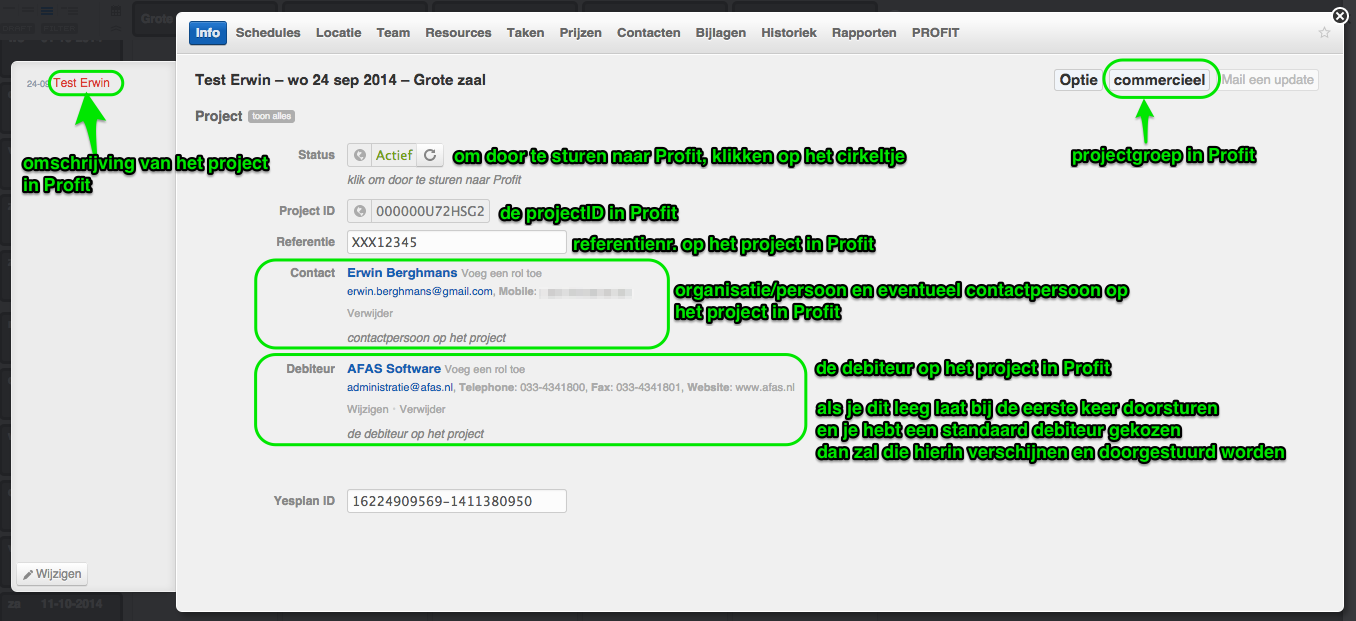De klant (contact) die aan het evenementen toegekend is in Yesplan, zal doorstromen als debiteur naar het project binnen Profit.
