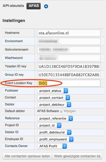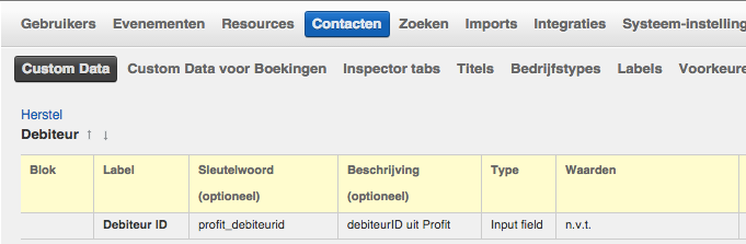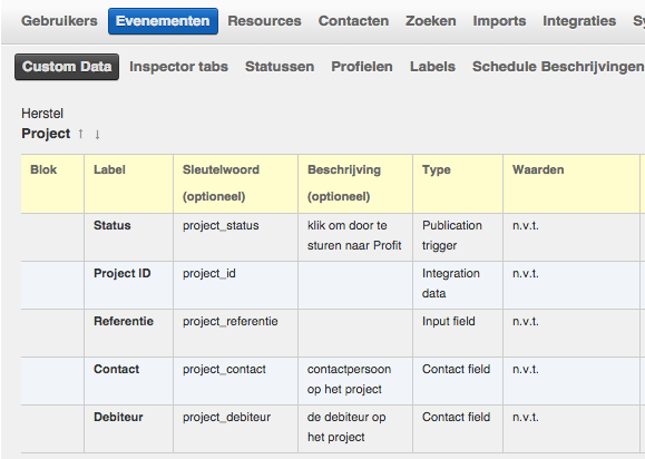 Zowel het Yesplan ID van een evenement als van een evenementgroep worden mee op het project geplaatst in Profit. Deze vrije velden in Profit worden geïdentificeerd door een “key”.