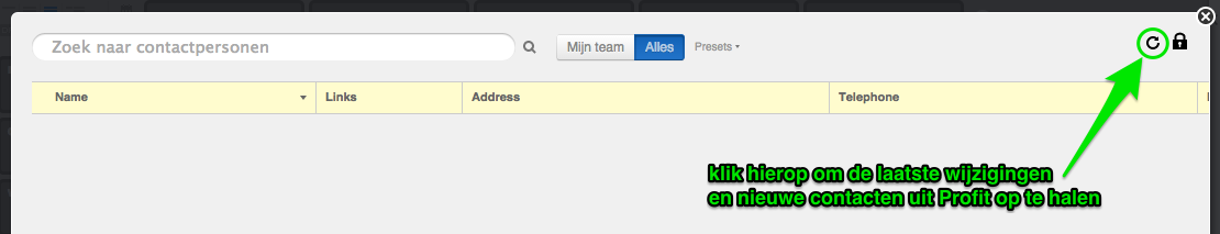Zowel Yesplan als Profit beschikken over een contactendatabank, maar het is niet wenselijk om contactgegevens op twee plaatsen te beheren. Er is gekozen om contacten volledig te beheren in Profit. Contacten die ook nodig zijn in Yesplan kunnen opgehaald worden uit Profit.