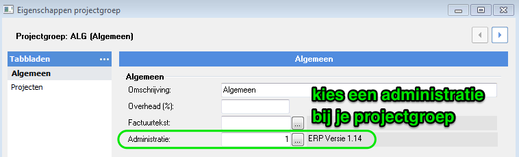 Zorg ervoor dat als je de projectgroepen aanmaakt in Profit je ook de bijbehorende administratie kiest. Als je dit niet doet dan kan je geen projecten aanmaken vanuit Yesplan.