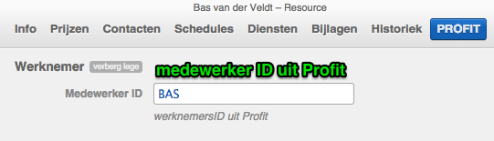 Medewerkers worden ook in Profit beheerd. De contacten die ook medewerkers zijn in Profit, worden zo overgenomen in Yesplan. De medewerker (een resource van het type “Persoon”) en het bijhorende gekoppeld contact worden beiden aangemaakt in Yesplan.