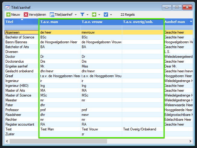 In het geval van een man worden de waarden uit de kolom “T.a.v. man” gebruikt in Yesplan, in het geval van een vrouw worden de waarden uit de kolom “T.a.v. vrouw” gebruikt, en in het geval van de geslachten “Overig” en “Onbekend” worden de waarden uit de kolom “T.a.v. overig/onb.” gebruikt. De waarden worden automatisch aangemaakt in Yesplan wanneer ze in gebruik zijn bij de contacten die naar Yesplan doorstromen.