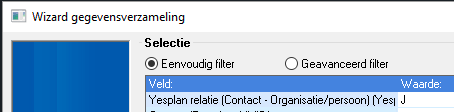 Op het laatste veld in de tabel, “Yesplan relatie”, moet je in de gegevensverzameling een filter plaatsen met “J” als “Waarde”: