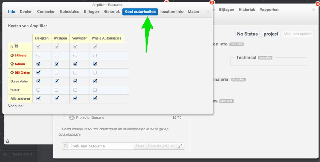 De autorisaties over de kostinformatie van plaatshouders, moeten je per plaatshouder instellen. Dit is identiek aan hoe je de autorisaties voor locaties instelt en gebeurt via de Resource Inspector of via de Algemene Instellingen in het tabblad “Resource Rollen”.