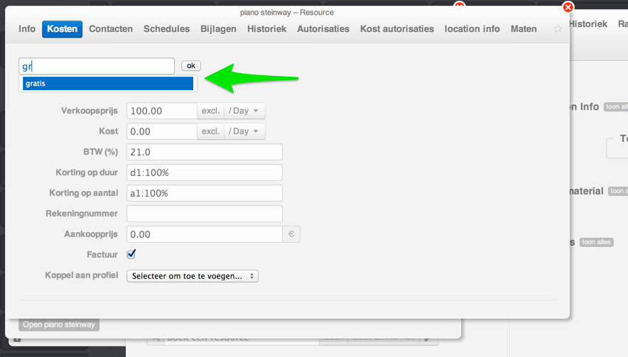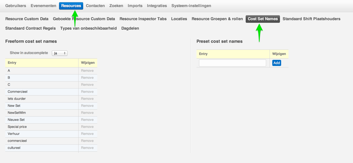 Het beheer van de suggestie lijst en de voorgedefiniëerde lijst van namen gebeurt in de Algemene Instellingen onder Resources > kostenset Namen.