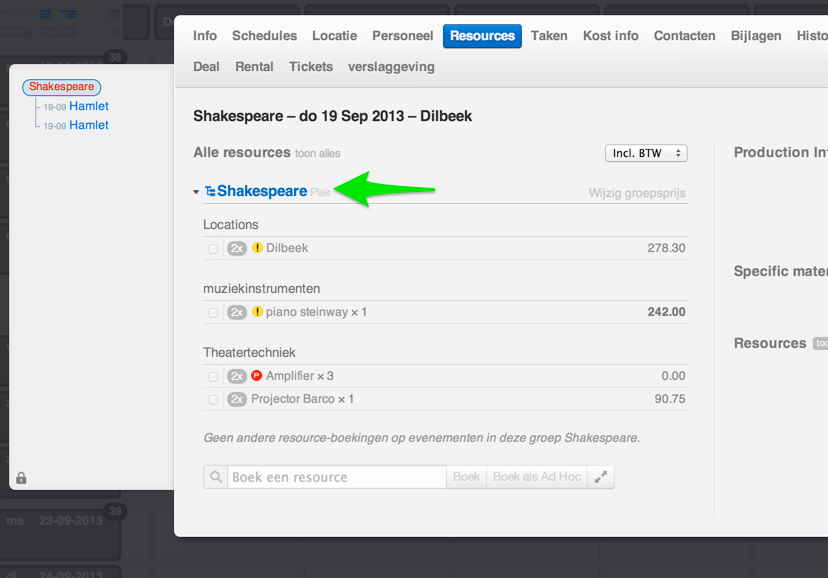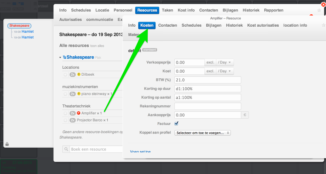 De kostenset met identieke naam zal op de nieuwe resource boeking automatisch actief geplaatst worden indien deze aanwezig is. Deze overeenkomst per naam is conform de werking van het selecteren van een kostenset voor alle boekingen op een evenement of evenementgroep. Zie ook verder in dit document de nieuwe functionaliteit om de namen van kostensets te beheren.