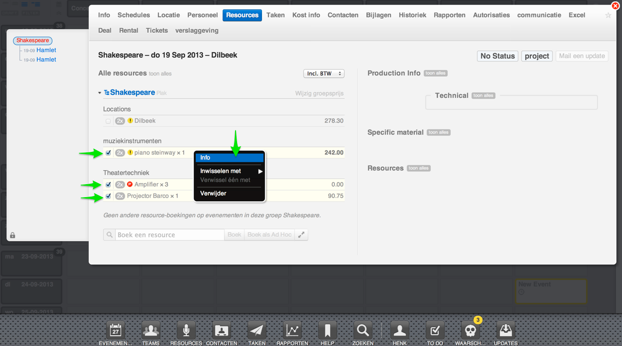 In de Event Inspector kan je meerdere resourceboekingen tegelijk selecteren, waarna je groepsacties op alle geselecteerde boekingen kan uitvoeren via het rechtermuisknopmenu. Zo kan men de Geboekte Resource Inspector openen op alle geselecteerde boekingen door de “Info” functie of kan men meerdere boekingen gelijktijdig verwijderen met de “Verwijder” functie. Ook het inwisselen van plaatshouders werkt op alle geselecteerde boekingen.
