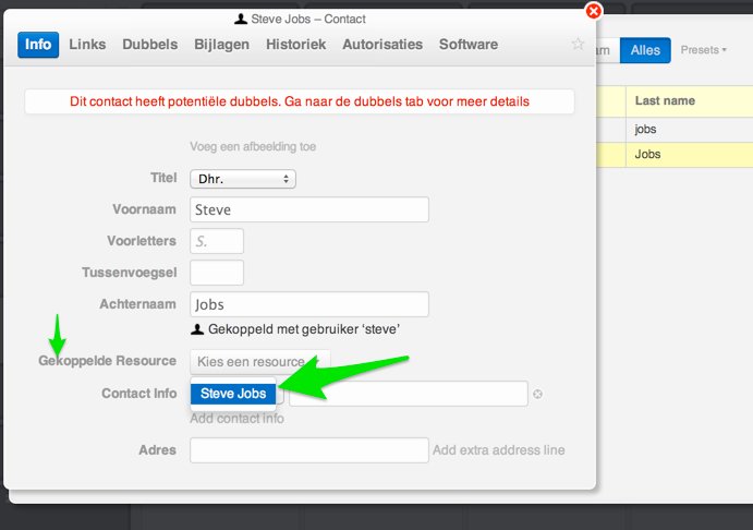 • Of link aan bestaand contact waarvan de naam identiek is aan de gebruikersnaam en maak tegelijk een nieuwe resource aan.