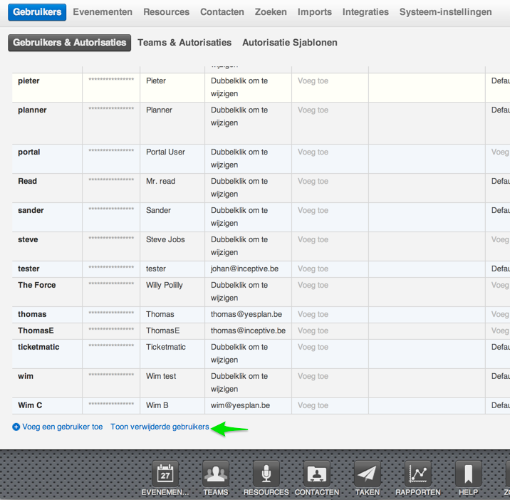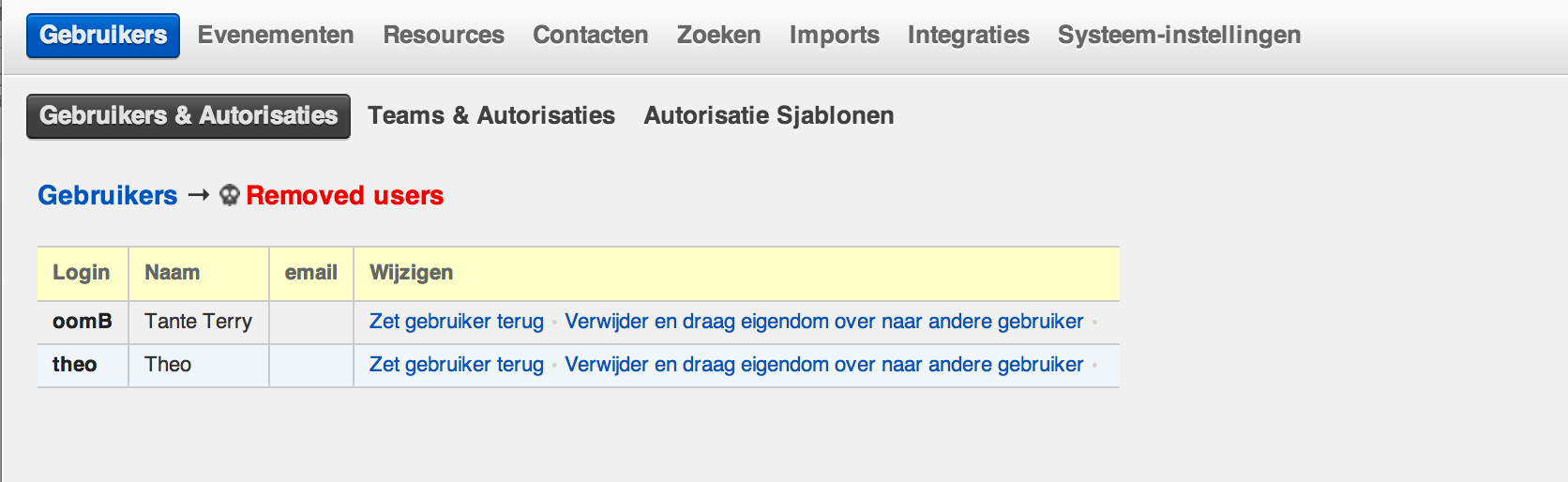 Een Yesplan administrator kan de verwijderde gebruikers nog editeren om, bvb. de autorisatieregels aan te passen. Je kan hier verwijderde gebruikers terugplaatsen of definitief verwijderen. Bij het definitief verwijderen draagt men ook alle evenementen, contacten, resources, e.d. waar de gebruiker in Yesplan eigenaar van was, over naar een andere Yesplan gebruiker.