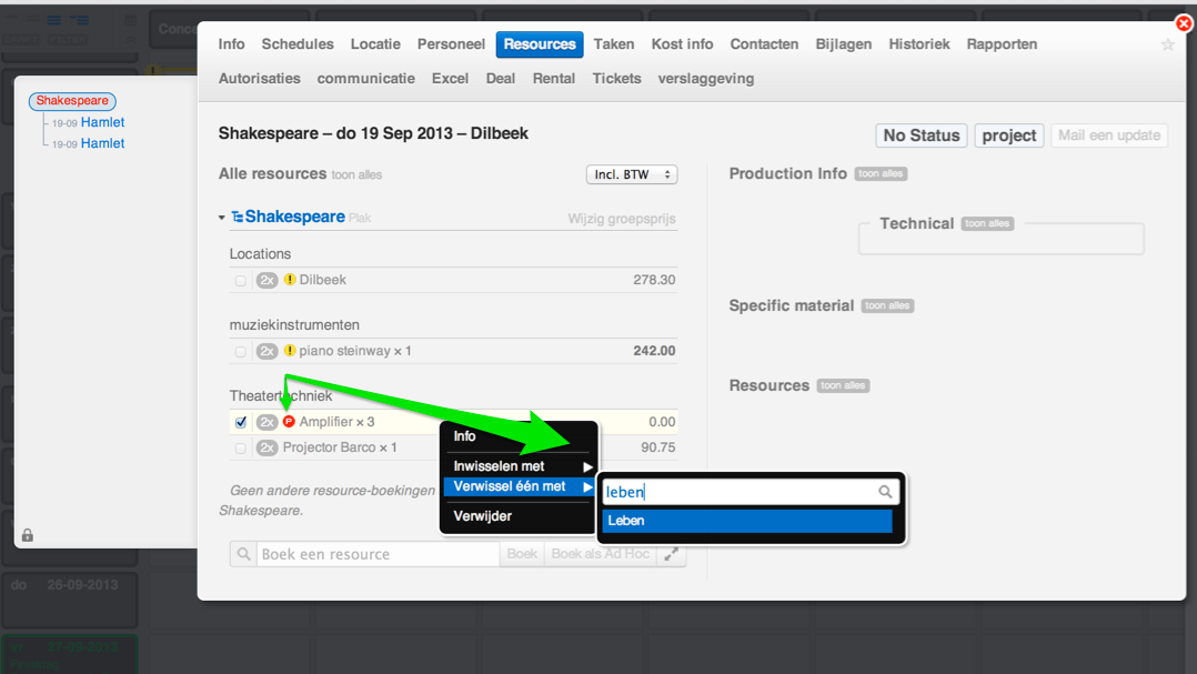 Wanneer een boeking van een resource of plaatshouder een meervoudig aantal heeft, dan zal het inwisselen ervan een boeking met een identiek aantal aanmaken. Dit is echter niet altijd gewenst bij het inwisselen van een plaatshouder. In deze gevallen wordt ook de handeling “Verwissel één met” actief in het menu. Wanneer men, bvb. 3 plaatshouders Lichttechnieker geboekt heeft, kan men hiermee één van deze plaatshouders inwisselen met een resource. Deze functie laat dus toe om elk van de drie plaatshouders één voor één in te wisselen met een andere resource.