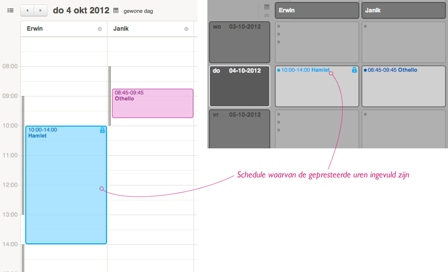 • Je kan schedules waaraan gepresteerde uren toegevoegd zijn niet meer verplaatsen (er verschijnt een slotje).