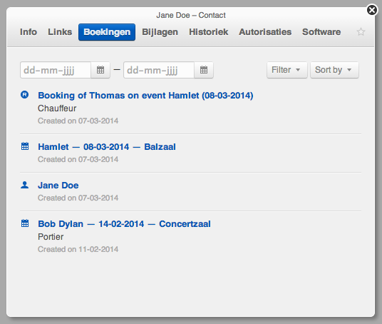 Je kan de contactboekingen filteren volgens geboekt op evenementen, resources en/of contacten, je kan ze sorteren op naam of op datum van aanmaak van de boeking, en je kan het zoeken beperken in tijd (voor, na of tussen bepaalde datums).
