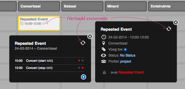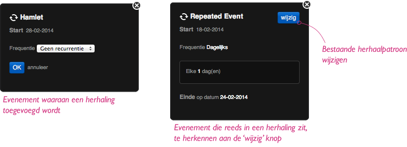 • Het infovenster voor een herhaalpatroon toont nu ook explicieter wanneer je een evenement (of Teamplanner schedule) bekijkt die reeds in een herhaalpatroon zit.