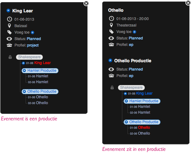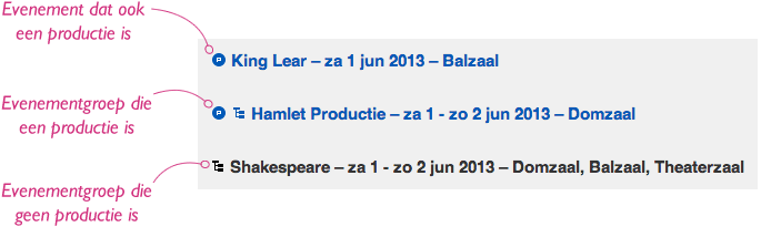 In de info bubble in de kalender worden een evenement en de productie waartoe het behoort nu duidelijker opgesomd.