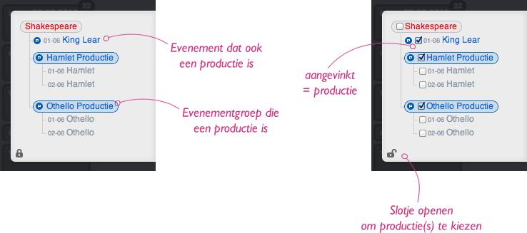 Evenementen (die al dan niet in een evenementgroep zitten) kunnen vanaf heden op zichzelf een productie zijn. Voorheen kon je enkel een evenementgroep aanduiden als een productie.