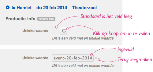 Een unique sequence custom data veld is standaard leeg, en zal een unieke waarde krijgen op het moment dat er op de knop gedrukt wordt bij het evenement, de resource of het contact.