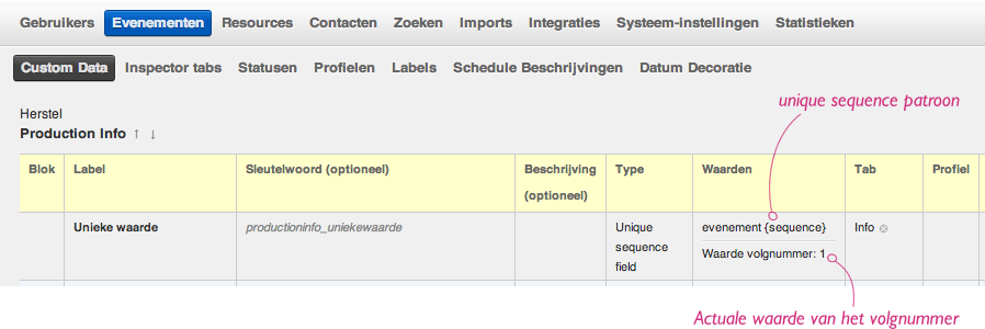 Een unique sequence is een nieuw custom data veld dat een unieke waarde bevat. Je kan het toevoegen aan evenementen, resources, resource boekingen, contacten en contact boekingen.
