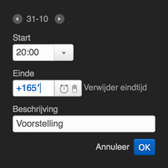Via het detailvenster van de boeking kan je de tijden van de boeking aanpassen. Voortaan kan je voor de start- of eindtijd van de boeking ook een tijdstip uit het tijdschema van het evenement kiezen. De boeking zal op die manier automatisch meevolgen met een of meerdere tijdstippen uit het tijdschema van het evenement.