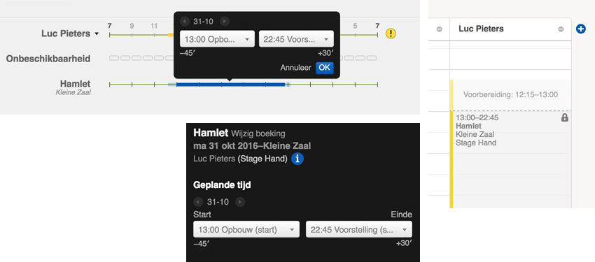 Trouwens, de conflicten verschijnen voortaan netjes opgedeeld per type met een vaste volgorde: evenement-conflicten (indien het tijdschema van het evenement buiten de daglijn gaat), resource-conflicten (voor bijvoorbeeld dubbele boekingen en zaalconflicten), contract-conflicten (voor bijvoorbeeld medewerkers die geboekt worden buiten hun dienst) en ten slotte meldingen voor nog niet ingevulde plaatshouders.